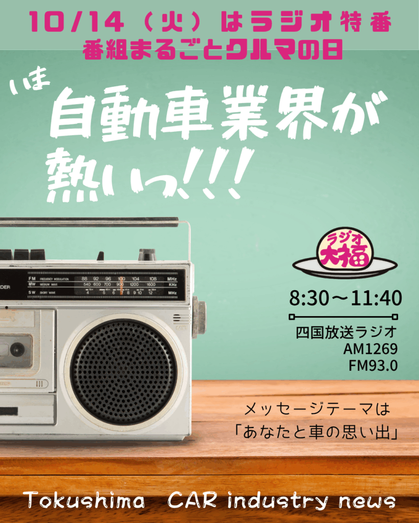 📅放送日:10月14日(火曜)8:30~11:40📻番組名:ラジオ大福特番「いま、自動車業界が熱いっ!!」