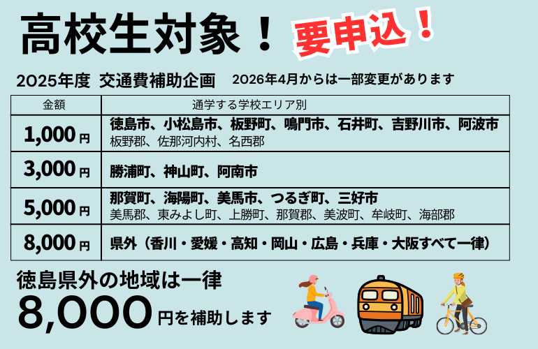 高校生対象の交通費補助は、以下の内容をご確認の上、ご活用ください。