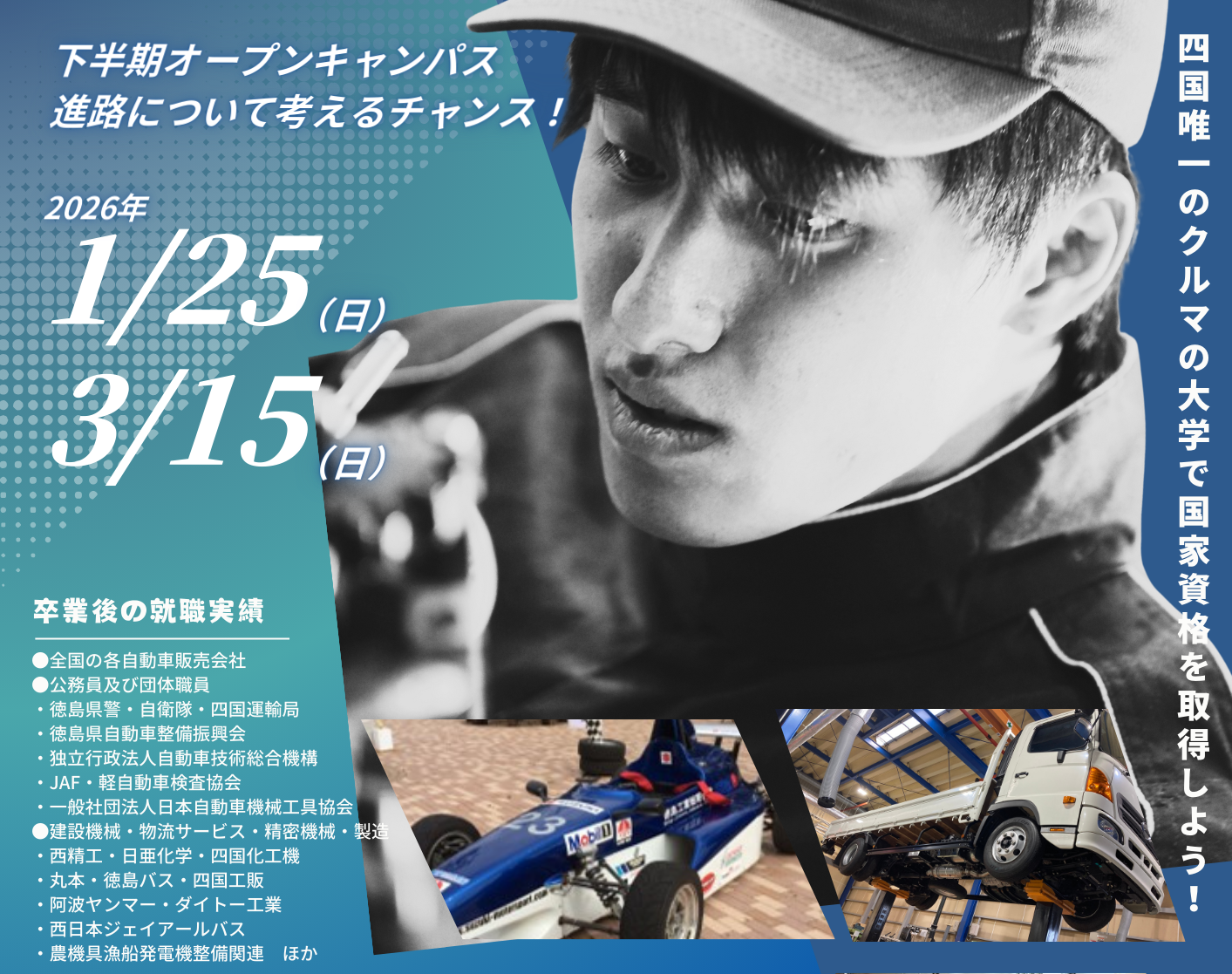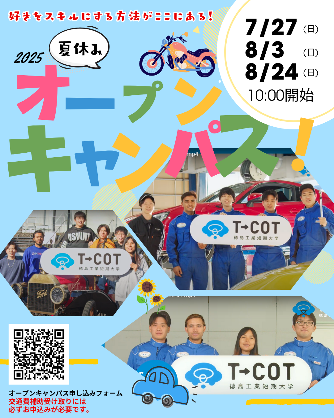 皆様、夏本番で大変暑い季節となってきましたが、如何お過ごしでしょうか。 T-COT徳島工業短期大学ではこの夏休み期間にオープンキャンパスを実施いたします。 今回の内容は ・電気装置実習体験 ・シャシ実習体験 ・エンジン実… 続きを読む 8月3日オープンキャンパス!