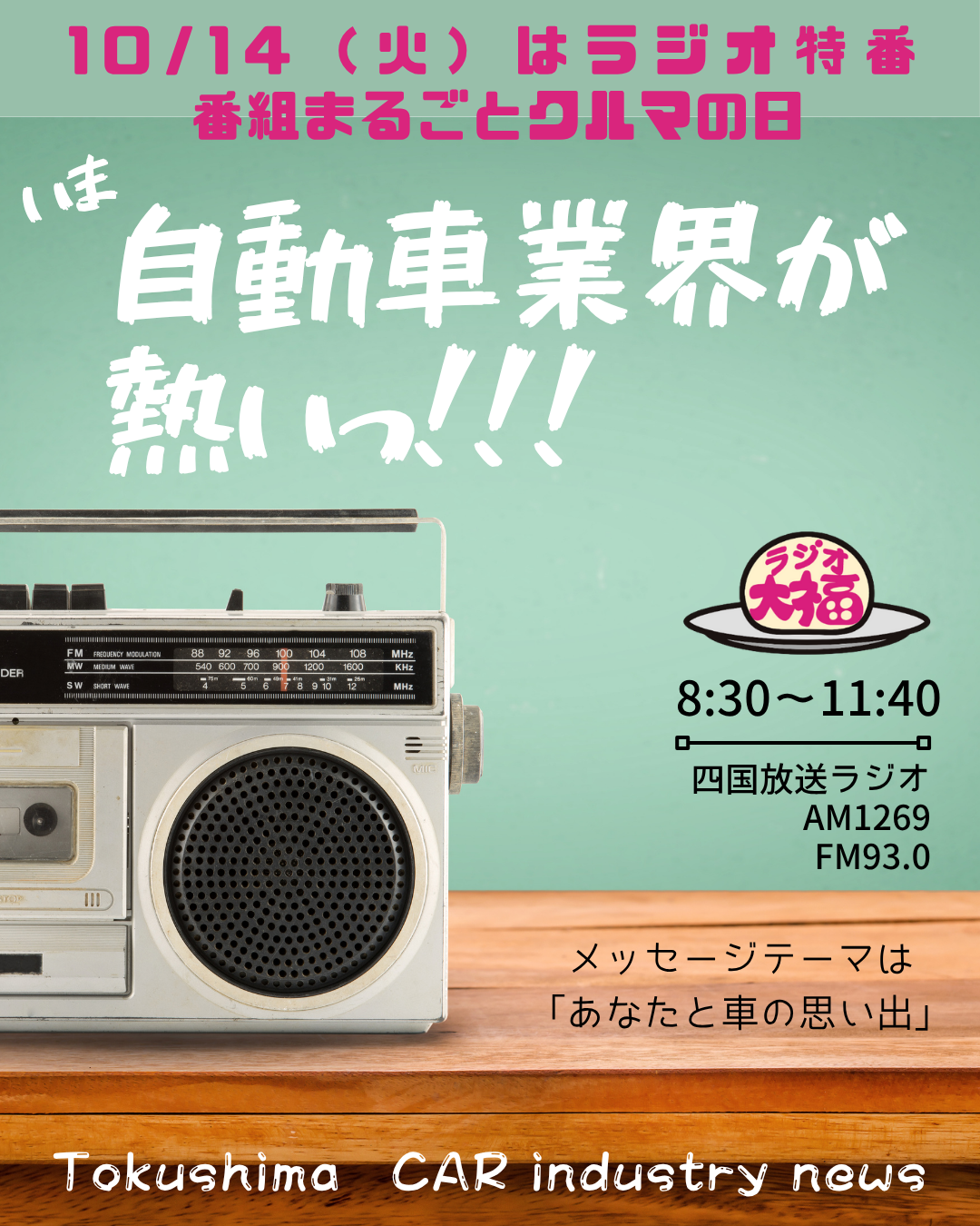 🚗ラジオ大福特番「いま、自動車業界が熱いっ!!」🚗 ディーラー4社×業界団体×T→COT職員が語る、自動車業界の過去・今・未来。 「子どもの頃のクルマと言えば…」「クルマにハマったきっかけ… 続きを読む 10/14四国放送ラジオ特番決定!